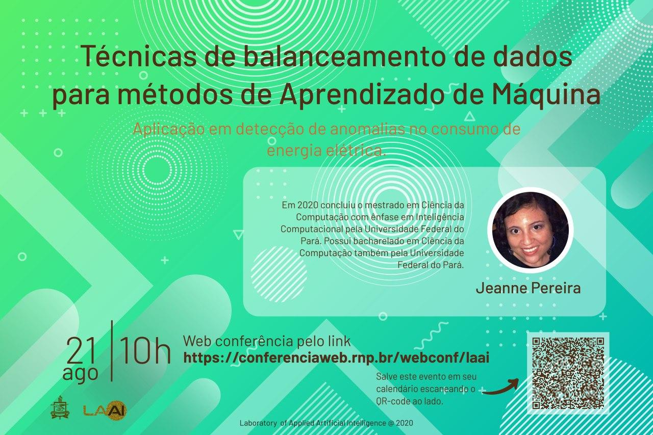 Dia 21/08 às 10:00h teremos o início de uma série de seminários a serem apresentados pelos membros do LAAI para divulgar as pesquisas desenvolvidas em inteligência artificial no laboratório. Nesta primeira edição, Jeanne Pereira falará sobre técnicas de balanceamento de dados em métodos de aprendizado de máquina, sua importância, funcionamento, e uma aplicação desse tema ao problema de detecção de anomalias em consumidores de energia. O seminário acontecerá na sala de vídeo conferência do LAAI. Confira nos links o banner do evento e um calendário para salvar em sua agenda.
