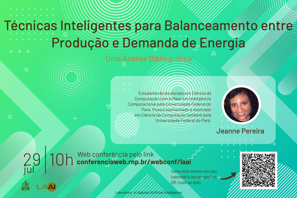 Dia 29/07 às 10:00h teremos mais uma edição do “Seminários LAAI” para divulgar as pesquisas desenvolvidas no laboratório. Nesta edição, Jeanne Pereira falará sobre técnicas inteligentes para balanceamento entre produção e demanda de energia elétrica, tema de seu doutorado. O seminário acontecerá na sala de vídeo conferência do LAAI. Confira nos links o banner do evento e um calendário para salvar em sua agenda.